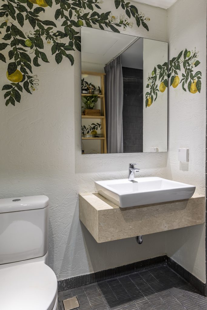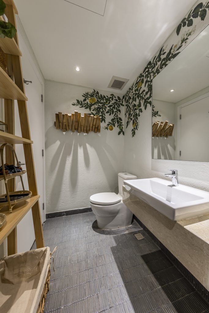 In the bathroom, the design language is maintained through white tiles, veined stone finishes, and natural wood cabinetry. The countertop-mounted basin sits on a white stone vanity, while a round mirror and warm lighting bring a soft, spa-like ambiance.