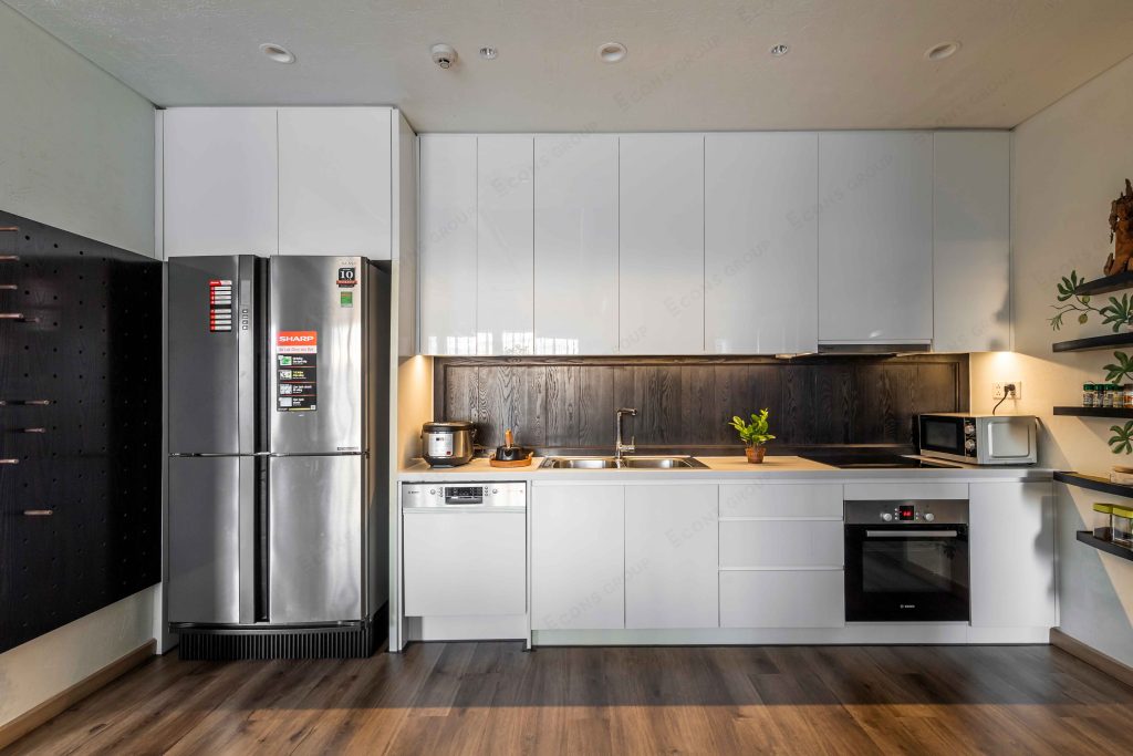 In the kitchen and dining area, minimalist white cabinetry blends seamlessly with the wall color. The white stone countertop and glossy glass backsplash enhance light reflection, maintaining a fresh and unified appearance. The wooden dining table and chairs, upholstered in neutral fabric, reflect an aesthetic of quiet refinement.