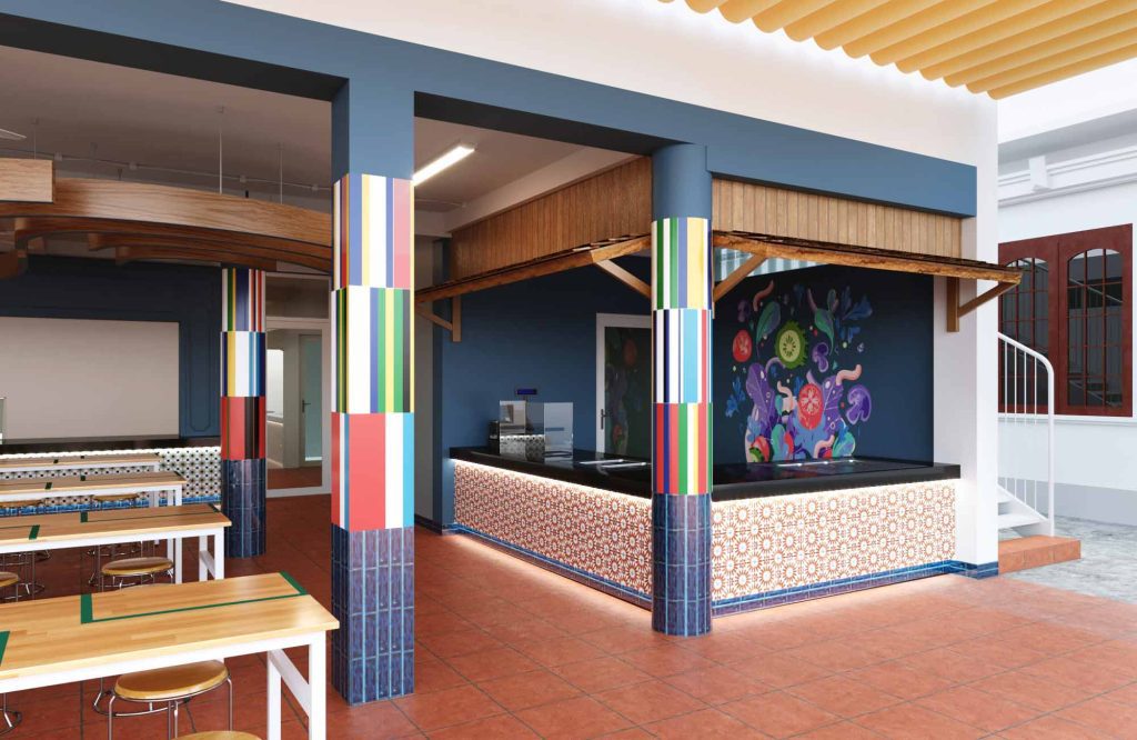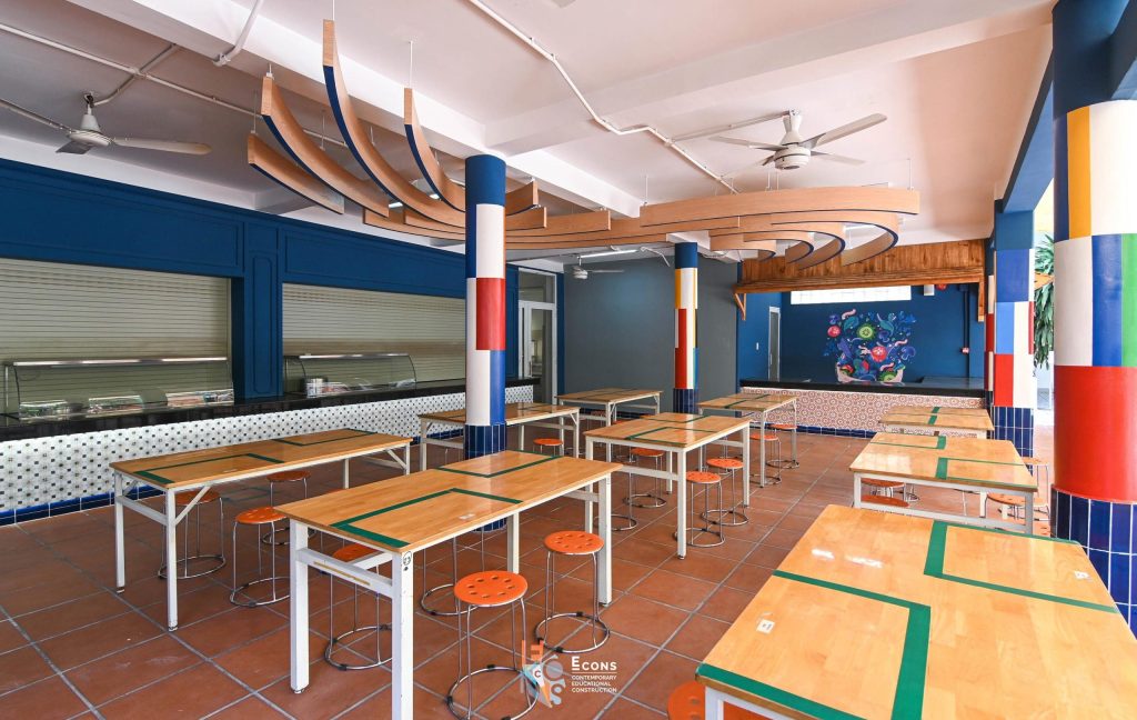 The newly designed canteen at EISHCM is more than just a dining space — it serves as a vibrant social hub for students, staff, and visitors. The interior layout prioritizes openness, fluid circulation, and accessibility, allowing users to move comfortably during peak hours. The spatial organization takes into account various group sizes, offering both communal tables and smaller, more intimate seating options.