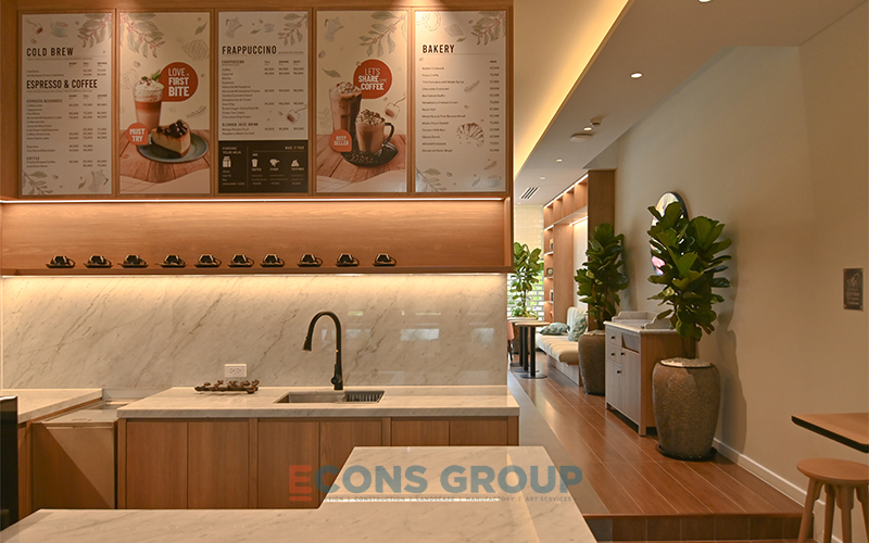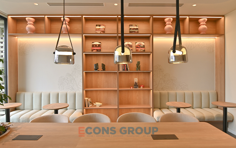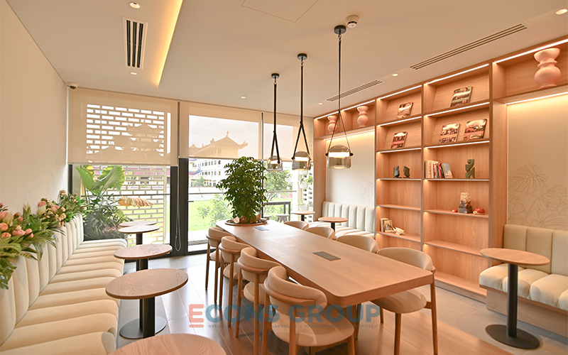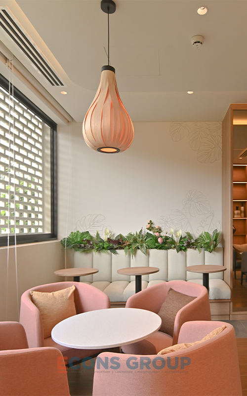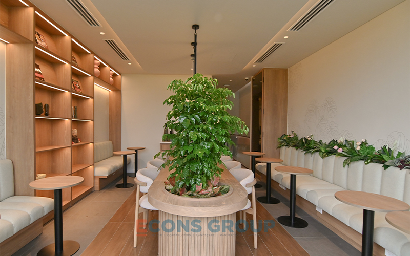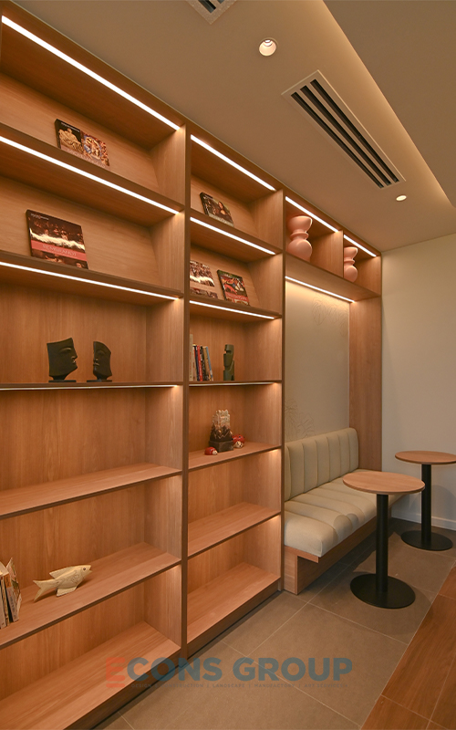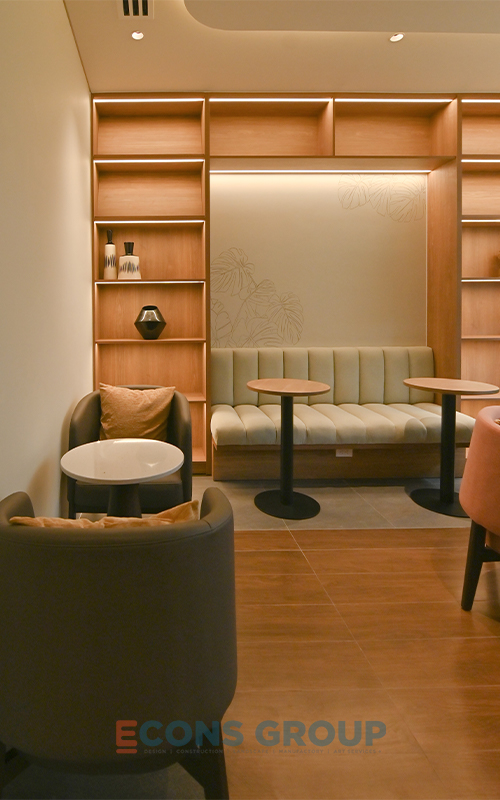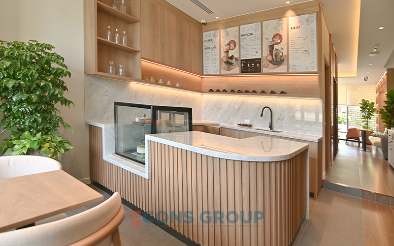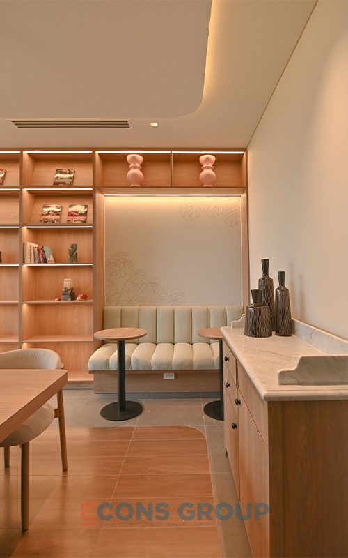 The first two floors serve as a café. The space is open and inviting, with natural materials like light wood, fabric upholstery, and stone used to bring a sense of calm. The bar counter is topped with veined stone in a soft beige hue, providing both durability and elegance. Cabinetry behind the bar features handle-less wooden panels, paired with soft yellow pendant lighting that complements the relaxed atmosphere.