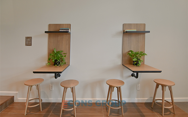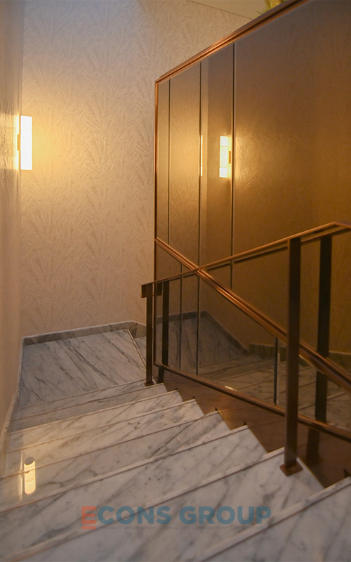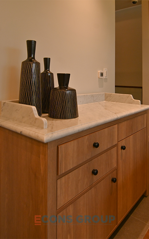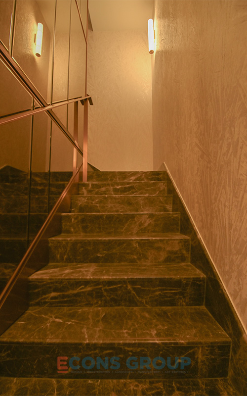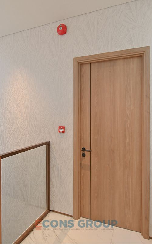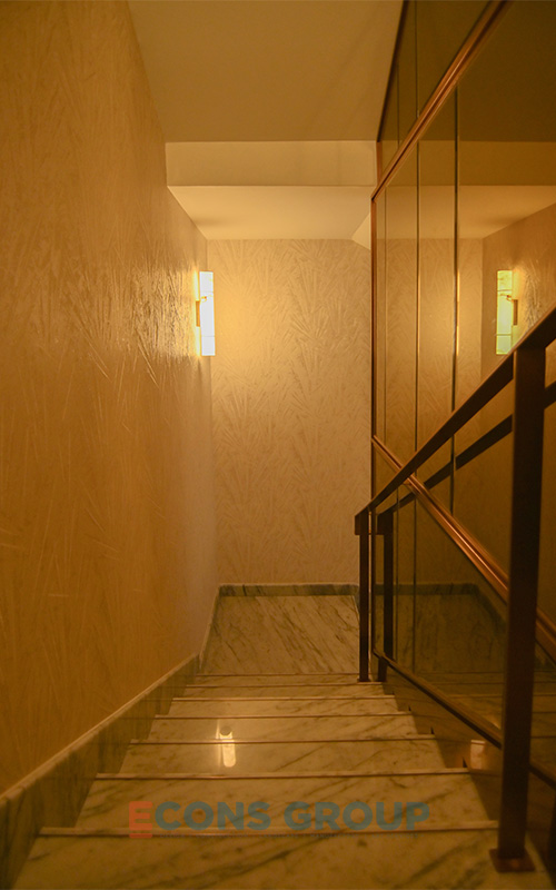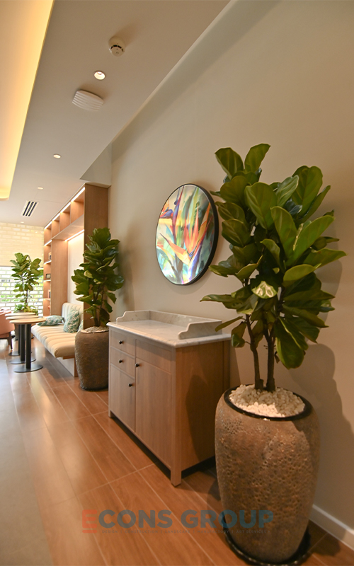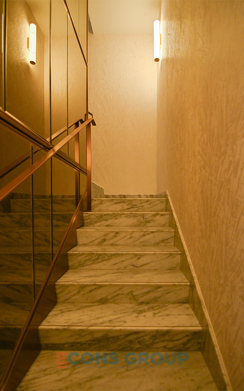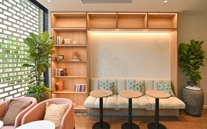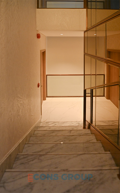The first two floors serve as a café. The space is open and inviting, with natural materials like light wood, fabric upholstery, and stone used to bring a sense of calm. The bar counter is topped with veined stone in a soft beige hue, providing both durability and elegance. Cabinetry behind the bar features handle-less wooden panels, paired with soft yellow pendant lighting that complements the relaxed atmosphere.