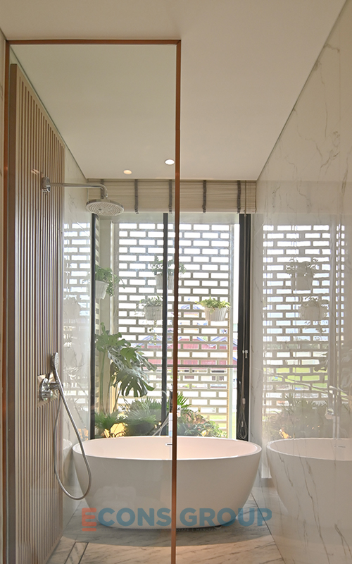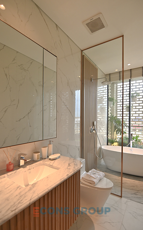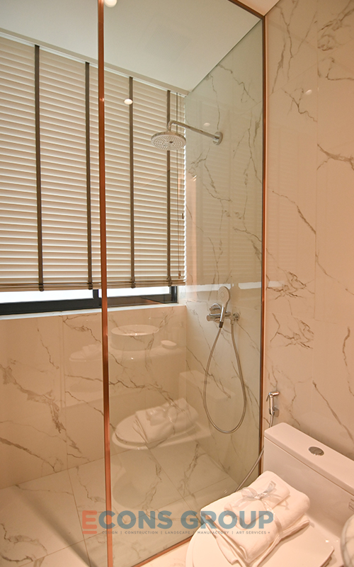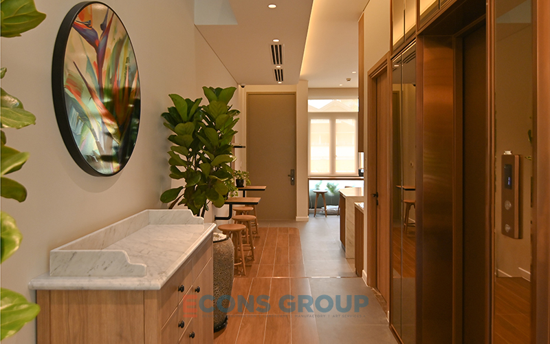 The interior design for this Global City shophouse reflects a well-considered approach to mixed-use living. Rather than a pure minimalist style, it blends warmth, functionality, and understated elegance through consistent material use—wood, stone, fabric—and a palette of neutrals and soft pastels. Each level has a clear purpose, making it an ideal model for future urban shophouses.
