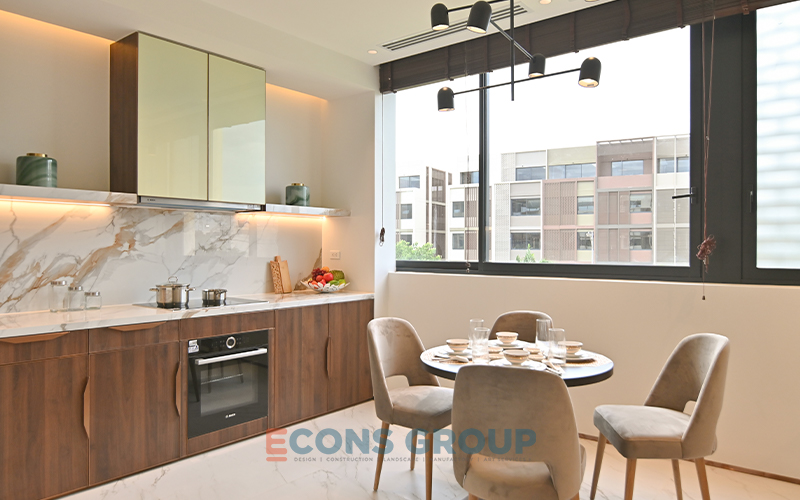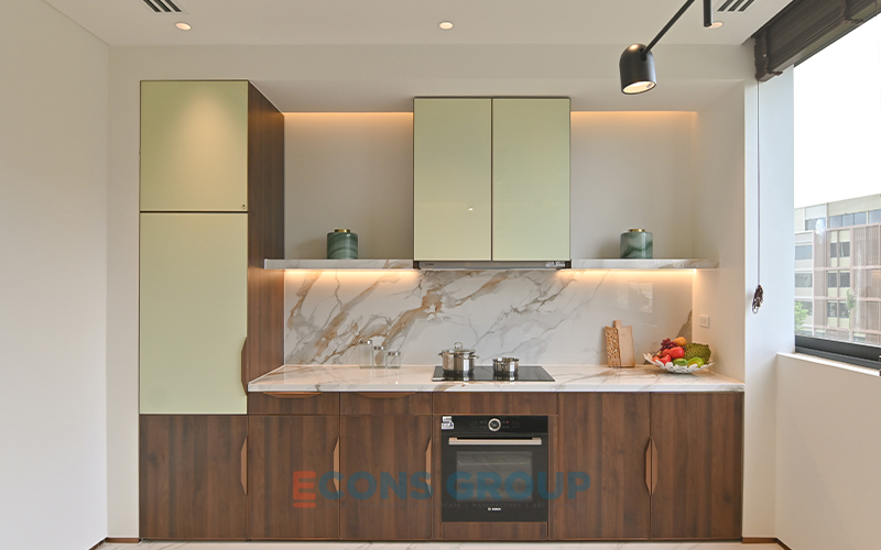 The kitchen is laid out in a linear format along one wall—no island included—maximizing space efficiency. The countertop is made of the same veined stone as the café’s bar, ensuring visual continuity. Upper cabinets feature a soft mint green tone for a fresh, youthful feel, while the base cabinets remain neutral to maintain balance and cleanliness.