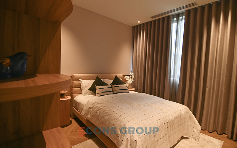 The fourth floor houses the master bedroom, where a fabric-upholstered bed in soft gray tones anchors the space. Matching bedside tables and built-in cabinetry create a unified look. Natural light is softened by beige curtains, offering both brightness and privacy. The en-suite bathroom features gray tiles and light stone surfaces for a clean, modern look. A rectangular mirror above the wall-mounted vanity helps extend vertical visual lines and enhances daily functionality.