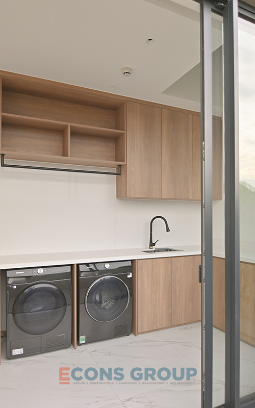 The fifth floor functions as a utility zone, featuring a laundry area, built-in storage, and a compact outdoor balcony paved with wood-textured decking—perfect for morning relaxation.