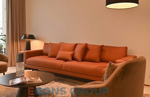 The third floor serves as a shared family space, combining the living room and kitchen. A terracotta-orange sofa becomes the room’s focal point, standing out against white walls and light wood flooring. The round coffee table features a simple metal frame without a stone top, keeping the area visually light and functional. A low-profile TV cabinet in matching wood maintains cohesion throughout the space.