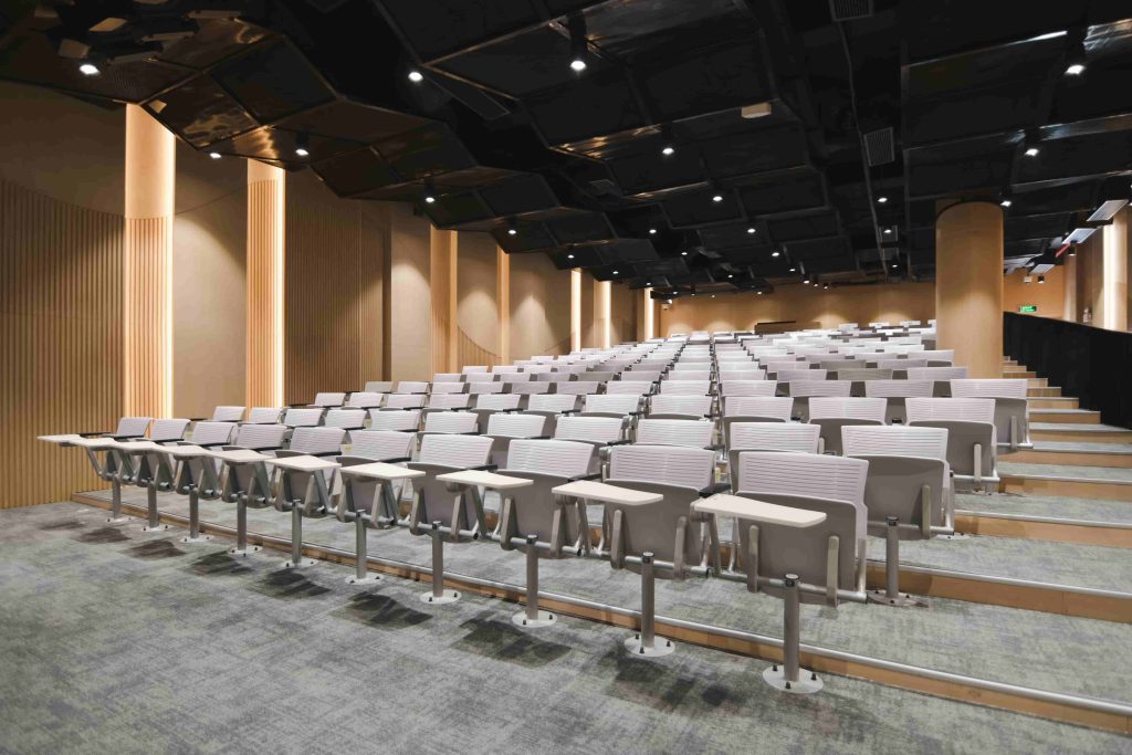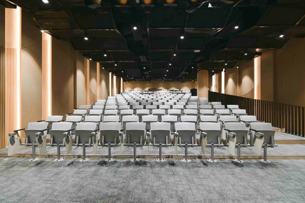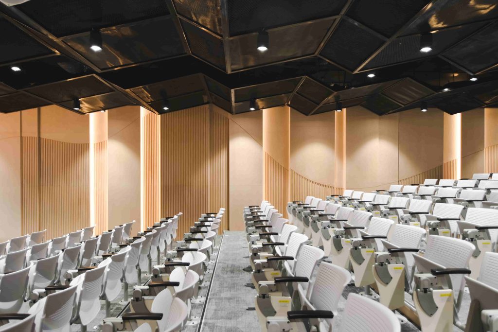 One of the most impressive features of the Auditorium is its specialized acoustic wall system. Understanding the importance of sound quality in an auditorium environment, Econs applied a customized sound-absorbing wall solution to optimize the acoustics of the space.