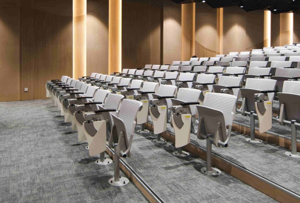 The color palette of the auditorium blends neutral tones with warm wooden accents. This combination not only enhances the space’s elegance but also creates a welcoming, sophisticated atmosphere suitable for various school events — from formal ceremonies to art performances.
