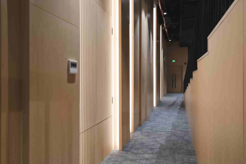 The acoustic walls are designed with sound-absorbing panels finished in neutral fabric tones, helping to reduce echo, control sound reverberation, and ensure clarity during speeches, presentations, or musical performances. This technical solution enhances the audience’s listening experience, making every sound detail clear and precise, even in a large open space.