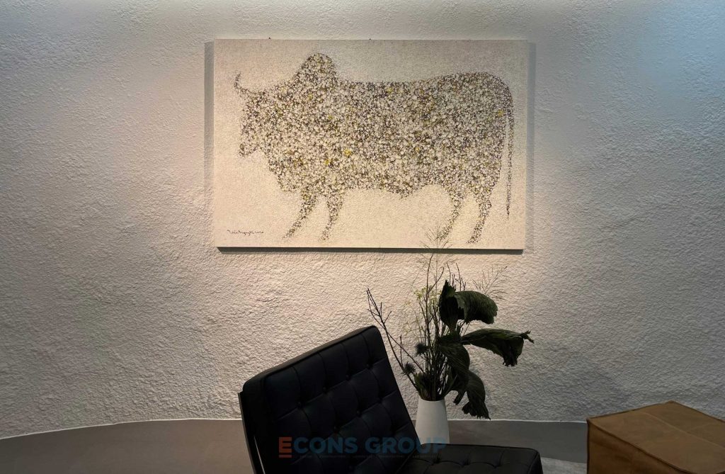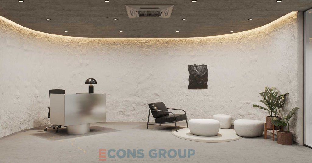 One of the most eye-catching areas is the reception zone, where a custom-designed counter becomes an immediate focal point. Sculptural in form, the reception desk is finished with high-end textured paint that mimics the look and feel of natural stone — subtly luxurious yet undeniably unique. Its organic curves soften the space and invite guests in with a sense of both professionalism and approachability.