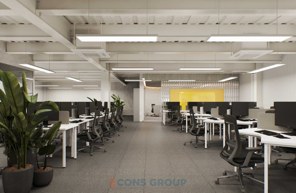 Moving further into the office, the main working area is meticulously arranged for both productivity and collaboration. Desks are laid out in structured rows that maximize space efficiency while preserving clear lines of sight. Natural light streams in through large glazed panels, while open shelving and low dividers maintain a sense of connectivity. The space is designed to evolve — allowing flexibility for future reconfiguration while maintaining order and flow.