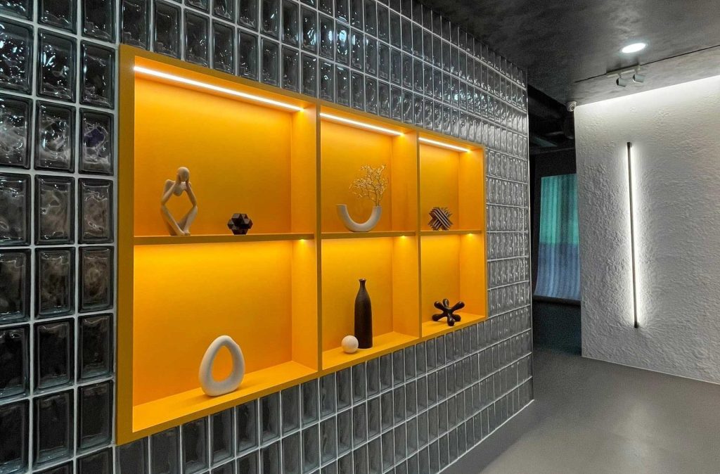 Behind the reception counter lies a stunning feature wall made of glass bricks. This unconventional material choice adds a touch of elegance while maintaining transparency and light flow. The internal lighting within the glass brick structure creates a luminous glow, especially when paired with gold-toned metal framing, giving the cabinetry both presence and refinement. More than just storage, this unit serves as a visual anchor and storytelling piece that embodies ZEE’s brand spirit.